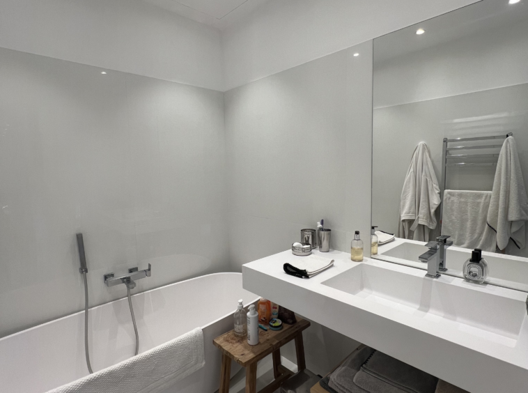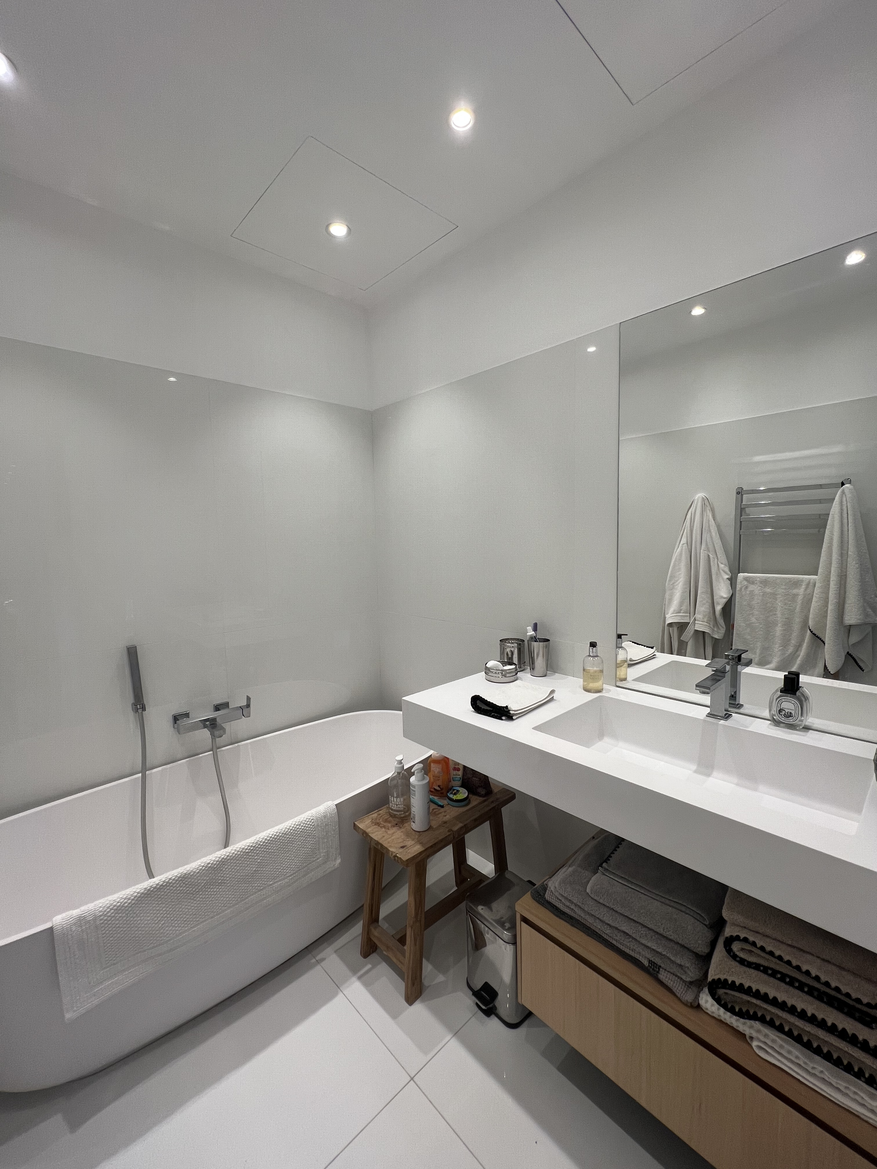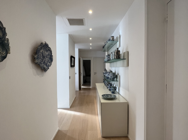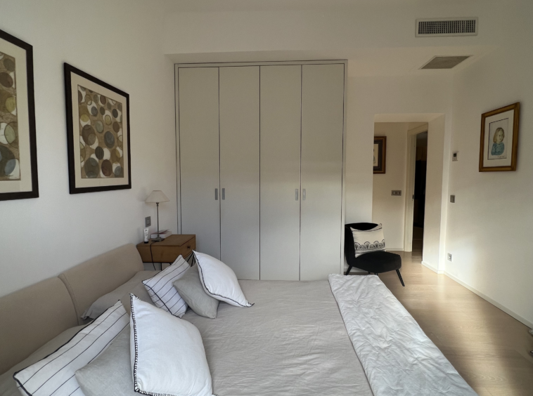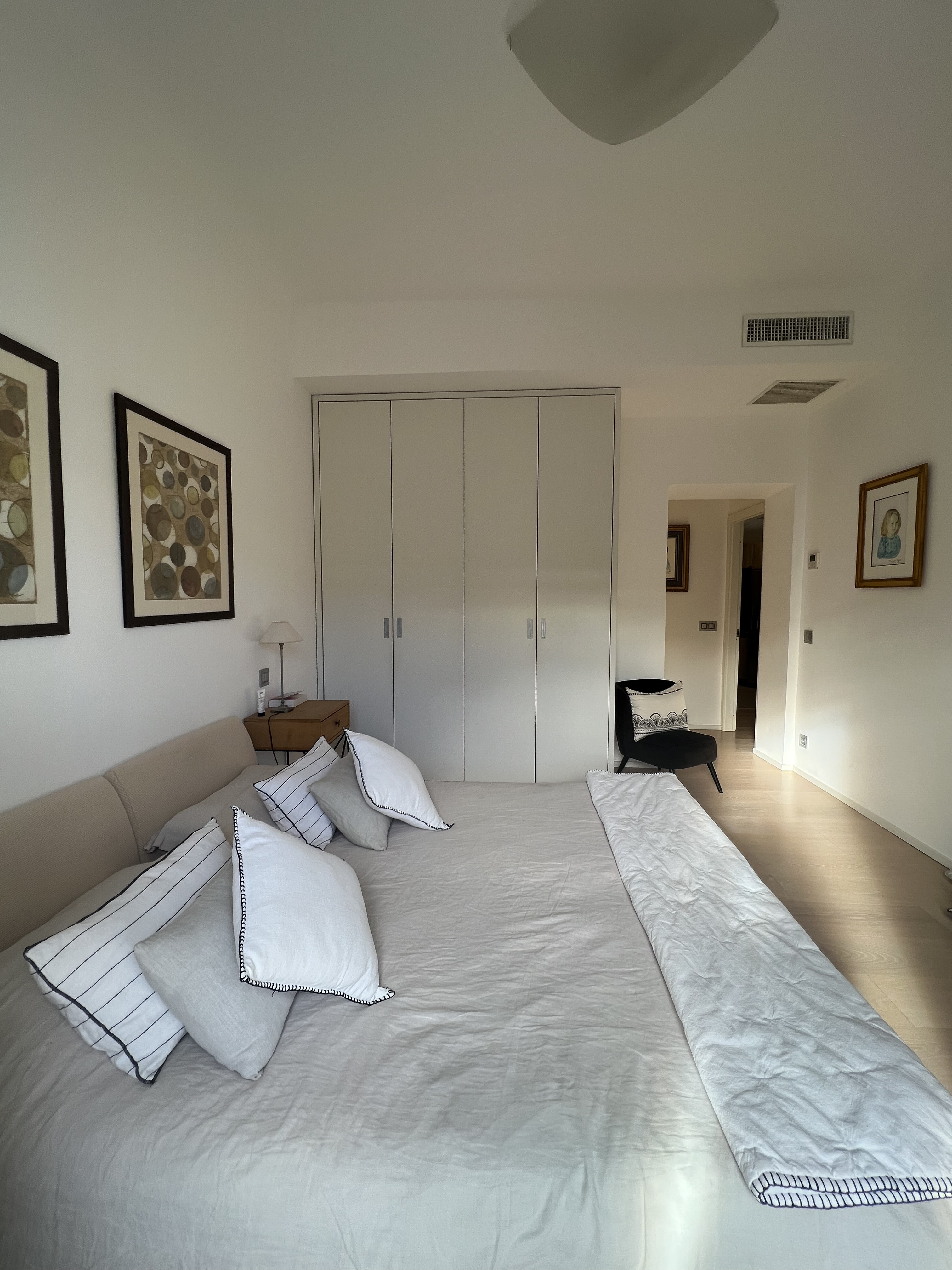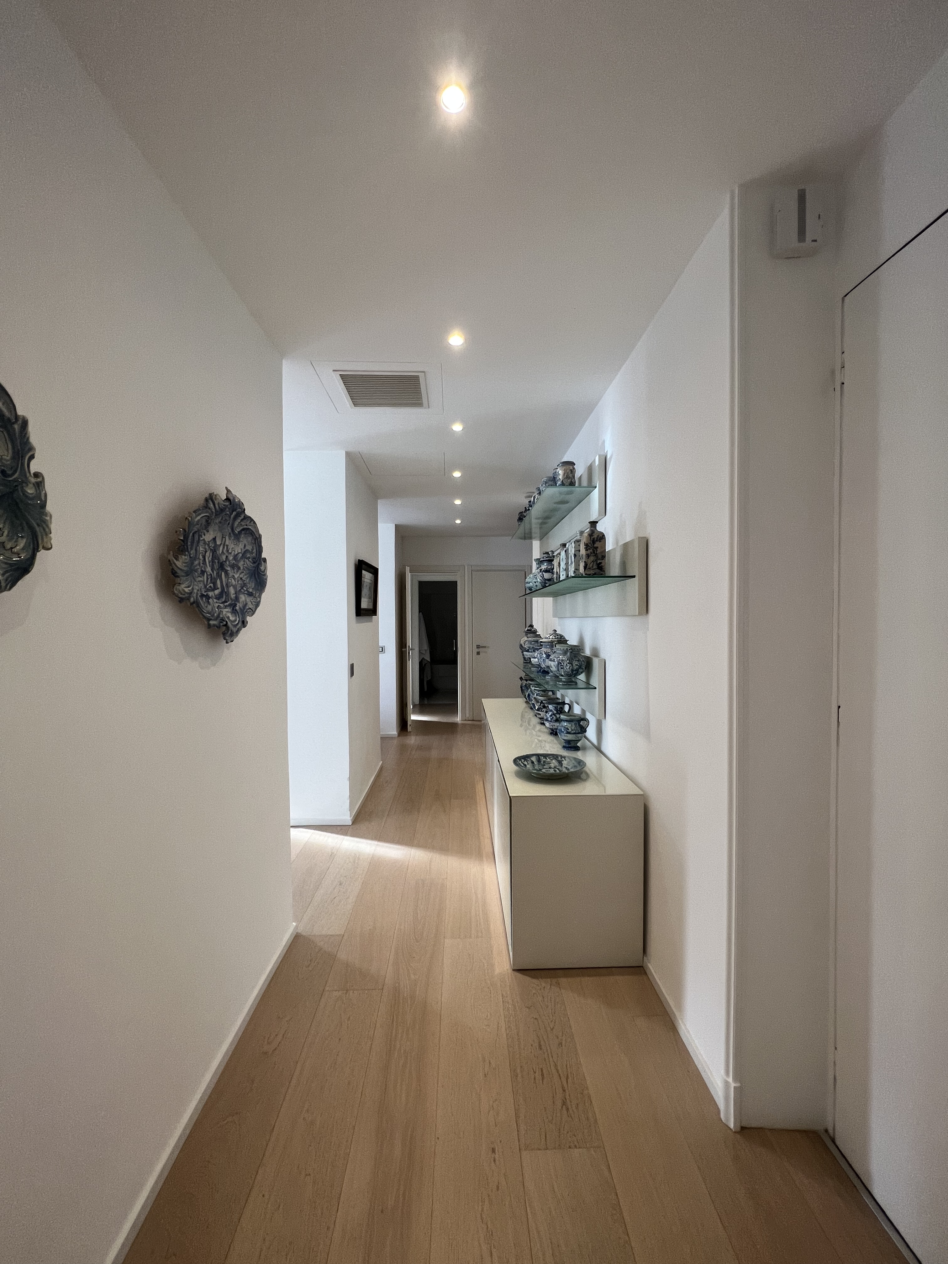 With natural daylight and a total surface of 150 sq.m, it comprises the following : entrance hall, double living room with bow-window and balcony, direct access to a fully-equipped kitchen, separate laundry room, guest toilet, master bedroom with balcony, closets and bathroom, a second bedroom with balcony, closets and shower room, and a third bedroom with bathroom.